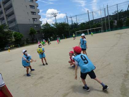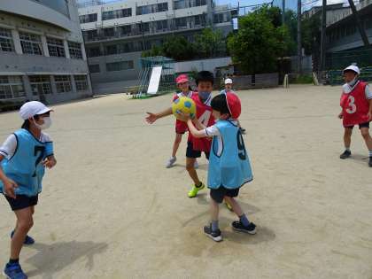 交流学級の友だちと一緒に,エンドボールを行いました。チームの子どもたちと一緒に作戦会議を行ったりパスの練習を行ったりしてから試合を行いました。試合では,交流学級の友だちと一緒に練習した成果を発揮することができ,嬉しそうでした。