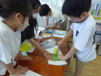 家庭科の学習では次の調理実習に向けてエア調理を行いました。ラミネートの道具ですが本物と同じように扱いながら取り組んでいます。調理への工夫が見つかるように学習を進めました。
