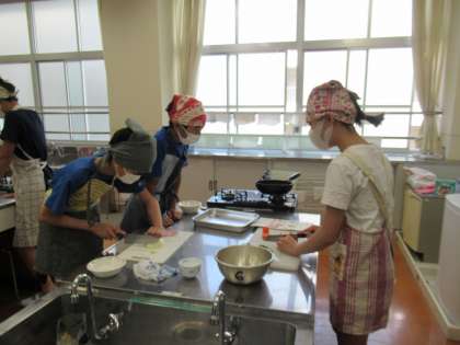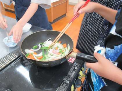 家庭科の学習では,ピーマン・にんじん・玉ねぎ・ハムを炒めて「いろどりいため」を作りました。グループで分担し,安全に気をつけて取り組むことができました。どの材料にも均等に火が通るように切り方や炒める順番に気をつけました。結果は「ちょうどよい焼き加減だった。」「玉ねぎが辛かった。」「にんじんが焦げた。」など,グループによってさまざまでした。学習したことをこれからの生活に生かしてほしいと思います。