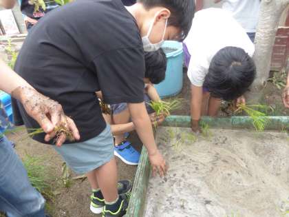 5年生 わくわく学習〜My work plan !〜 公開日 2022/06/16 更新日 2022/06/16 5年生のページ 5年生のわくわく学習は「My work plan !」として学習を進めています。今回は田植え体験をしました。地域の方に苗の植え方を教えていただきながら取り組みました。苗の今後の成長が楽しみです。また,お米の生長のことや働くことについてなど多くのことをインタビューさせていただきました。