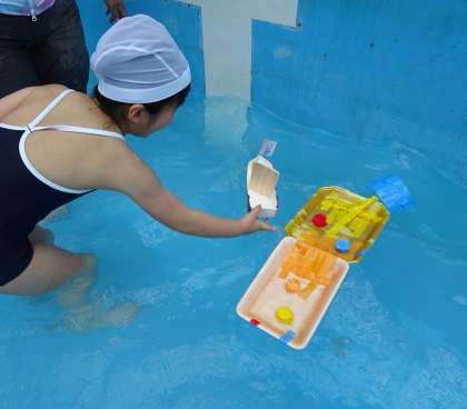 13日よりプール学習が始まりました。顔を水につけたり,図工で作った水を入れてあそぶおもちゃで水遊びをしたり,ビート板を使ってバタ足の練習をしたりしました。子どもたち一人ひとりに合わせて学習を行っています。安全に気をつけながら楽しく学習を進めていきたいと思います。
