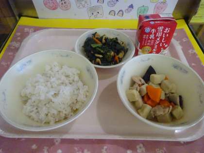 今日の給食は,麦ごはん・牛乳・高野どうふと野菜のたき合わせ・ほうれん草の煮びたしでした。