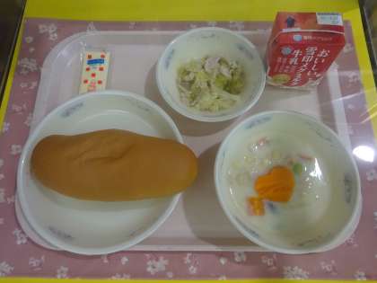今日の給食は,コッペパン・牛乳・ハムサンド(具)・チャウダーでした。ハムサンドの具にマヨネーズを混ぜて,自分でパンに挟むセルフサンドでした。パンの上に切れ目を入れる人,横に切れ目を入れる人,さまざまでした。楽しく食べられたようでした。