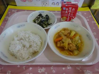 今日の給食は、麦ごはん・牛乳・タッカルビ・切干大根のいためナムルでした。