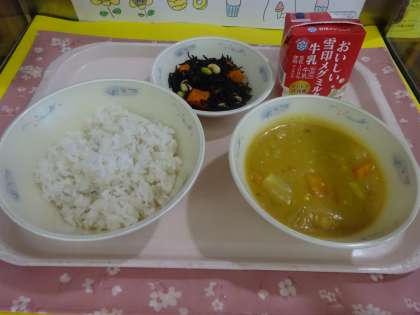 7月4日(月)の給食 公開日 2022/07/05 更新日 2022/07/05 ぱくぱく通信 給食の献立は、麦ごはん・牛乳・チキンカレー・ひじきのソテーでした。学校の給食のチキンカレーは、カルシウムがしっかりととれるようにチーズ・ヨーグルト・脱脂粉乳が使われています。まろやかな味で、ごはんもモリモリ食べることができました。