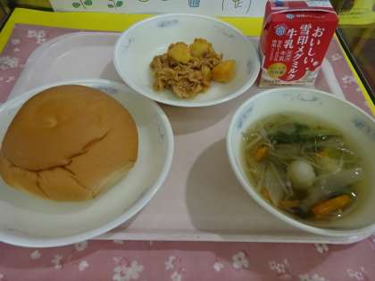 今日の給食は、バターうずまきパン・牛乳・豚肉のケチャップ煮・はるさめスープでした。