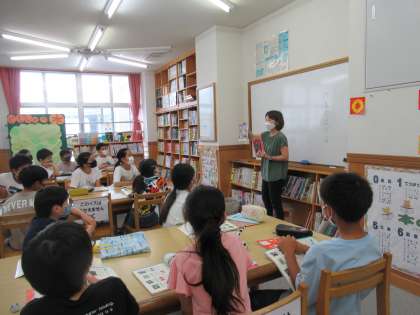 国語科〜作家で広げるわたしたちの読書〜 公開日 2022/07/05 更新日 2022/07/05 5年生のページ 今日は、図書館司書の川勝先生にブックトークをしてもらいました。「同じ作家の作品を読む」という読書体験の学習を始めました。川勝先生のブックトークを聞いた後で、自分たちが気になる作家やシリーズの本を探して読みました。本の選び方は人それぞれ自由ですが、作家をスタートにしていろいろな本に触れてほしいなと思います。