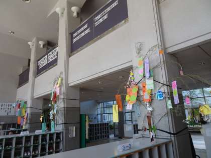 いよいよ明日は、七夕です!おひさま学級で取り組んでいる「おひさま七夕プロジェクト2022」も大詰めに入りました!今日は、各クラスや職員室から届いた短冊とおひさま学級で作った笹飾りを笹に飾り、正面玄関に飾りました!みんなの願いが叶いますように!!笹飾りは、1学期終業式まで掲示します。ぜひ、おひさま学級が取り組んだ笹飾りを見ていただけたらと思います。また、今回の学習内容を「おひさま新聞第2号」でまとめています。新聞は、正面玄関おひさま学級の靴箱の前に掲示していますので、ぜひ、ご覧いただけたらと思います。