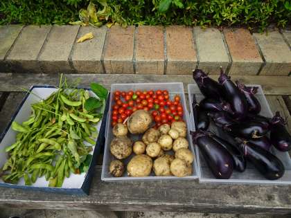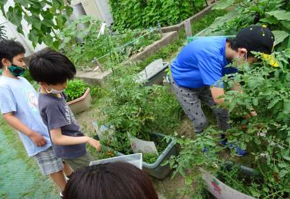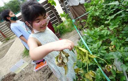 おひさま学級の畑で育てている野菜を収穫しました。11日(月)に、収穫した野菜を使って、「ジャガイモのガレット」、「ベーコンの野菜巻き」、「ゆで枝豆」を調理します。子どもたちで計画して、調理するメニューを決めました。早速、作り方を調べたり調理器具を準備したりと協力している様子が見られました!