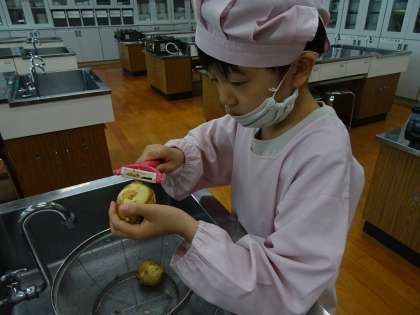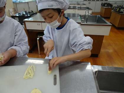 おひさま学級の畑で育てた野菜を使って「ジャガイモのガレット」、「ベーコンの野菜巻き」、「ゆで枝豆」を作りました。子どもたちは、作り方を見ながら協力して作っている様子が見られました。また、包丁で切る、ピーラーを使って皮をむく、フライ返しを使って、ジャガイモのガレットをひっくり返す等調理器具の名称や使い方を知りながら調理をすることもできました。