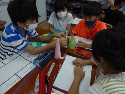 いつ花粉はおしべからめしべにつくのだろうか。その学習問題を解決する方法を考えました。朝顔の花に見立てた模型を使い、「こうすればいい。」など話し合いながら考えることができました。