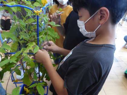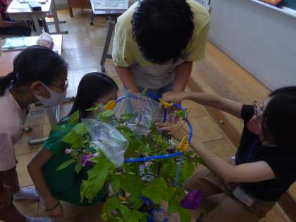 理科の実験準備をしました。朝顔の花を教室に持ち込み準備しています。