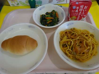9月13日(火)の給食は、小型バターロール・牛乳・イタリアンスパゲティ・ほうれん草のソテーでした。