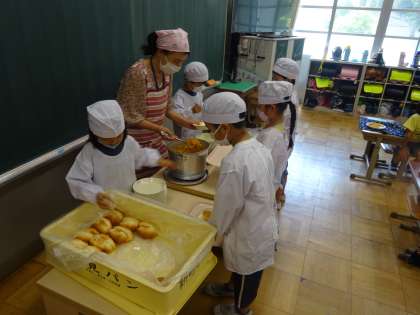 1年生も給食当番のお仕事がだんだん上手になっています。お家で料理を器に盛り付けたり運んだりするお手伝いをしている子もいました。少しずつできるようになることが増えてきて、嬉しそうな様子でした。