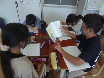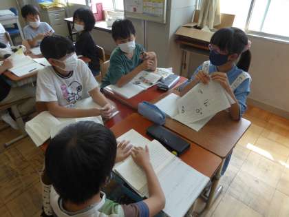 国語科では「たずねびと」の学習をしています。登場人物の「綾」の心情の変化はどう変わっていったのか。「綾」に影響を与えた物は何だったのか。など、話し合いを深めました。