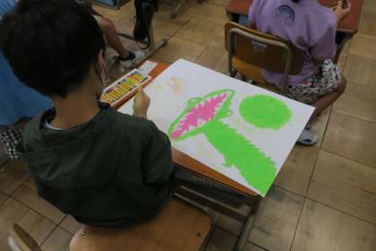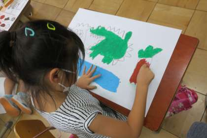お話を聞いて想像したことを絵にしています。 丁寧に塗って作品を完成させています。