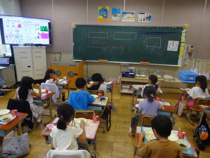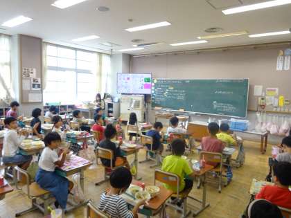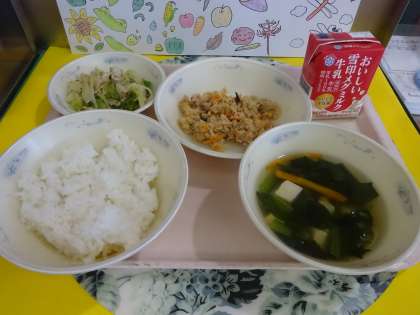 今日の給食は、ごはん・牛乳・おからツナ丼(具)・鶏肉とピーマンのごまいため・すまし汁でした。