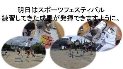 5年生 スポーツフェスティバルに向けて 公開日 2022/09/27 更新日 2022/09/27 5年生のページ いよいよ明日はスポーツフェスティバルです。今まで練習してきた成果が発揮できるように頑張ります。最後までご声援よろしくお願いします。