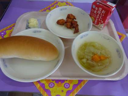 今日の給食は、ミルクコッペパン・牛乳・チキンのアングレス・野菜のスープ煮・チーズでした。