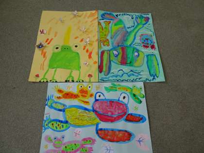 図工の時間に、お話を聞いて描く「お話の絵」の学習を行っています。おひさま学級は、いろいろな色のかえるが登場するお話の絵を描いています。今日の学習で、作品の仕上げを行い、作品が完成しました。