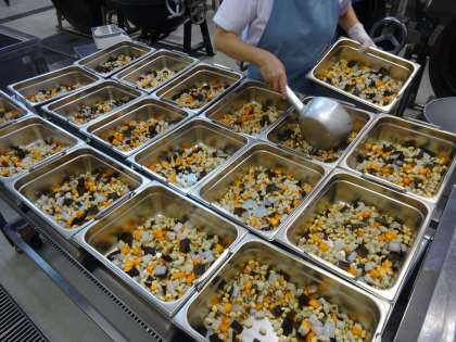 給食の献立は、麦ごはん・牛乳・豚肉とキャベツのみそいため・五目煮豆でした。五目煮豆は、スチームコンベクションオーブンを使って蒸して作りました。豆がふっくらしていて、甘く、おいしく食べることができました。