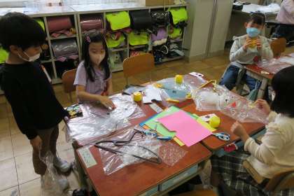ハンガーにビニール袋やビニールテープをつけて、風でひらひらゆれるかざりを作っています。ひらひらさせる方法をみつけ、楽しんで作品を作っていました。