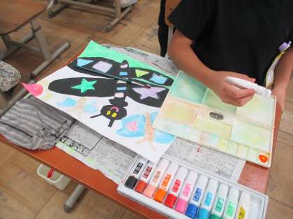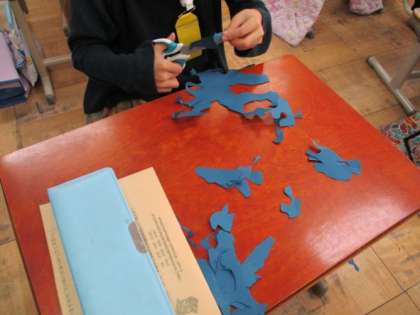 カッターで切った箇所に絵具を塗ったり,切った画用紙を並べて何に見えるか考えてたりして作品を仕上げています。