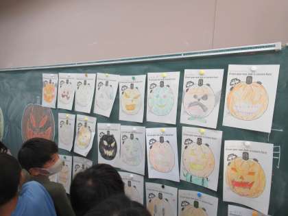 今日は、ALTのルイーズ先生に来ていただき、国旗やその国でできることの言い方を慣れ親しみました。ハロウィンが近いということで、カボチャの顔を描いてみんなで見合いました。もうすぐハロウィンパーティーです。教室に飾って楽しんでほしいと思います。