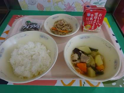 今日の給食は、ごはん・牛乳・豚肉と野菜の煮つけ・もやしのごまいため・じゃこでした。