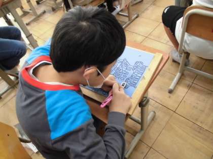 おひさま学級 交流5年 図工「彫り進めて刷り重ねて」 公開日 2022/11/04 更新日 2022/11/04 おひさま学級 版画の学習では、板に自分が作りたい世界遺産を描き、彫刻刀を使って彫り進めています。彫刻刀を使うことは1年ぶりですので、安全に気をつけながら学習を進めています。交流学級のの友だちと一緒に、集中して学習している様子が見られました。