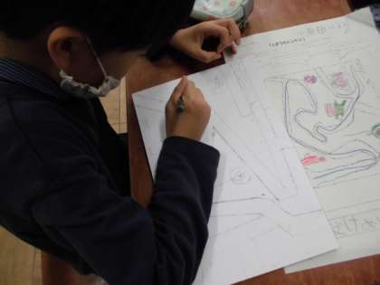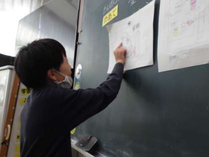 図工の学習では、「くぎうちトントン」の学習を行っています。今日の学習は、どんな内容にするのかを考えてから設計図を一人ひとり描き、その設計図を見ながら板に絵を描く学習を行いました。自分の設計図を友だちの前で発表する場面では、どのような作品にしていくのか発表することができました。次回の学習では、鉛筆で下描きした板にペンでなぞり、絵の具で彩色をする予定です。今後の学習が楽しみです。