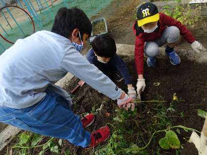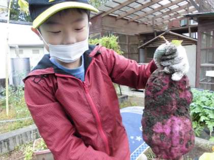 おひさま畑で育てているさつまいもを収穫しました。今年のさつまいもは、とても大きくておひさま学級の子どもたちはとても驚いていました!収穫したさつまいもは、11月24日におひさま学級で行う調理実習の材料に使います。どんなさつまいも料理になるのか楽しみです。
