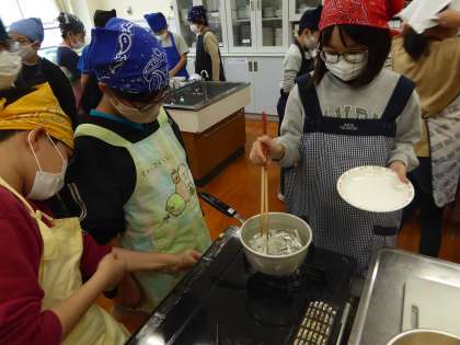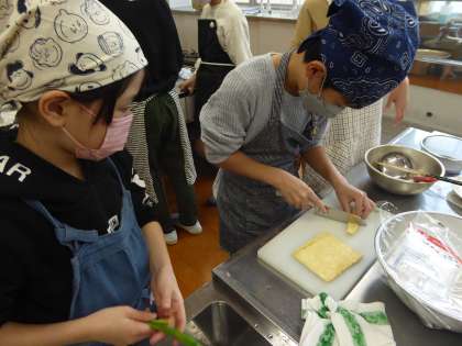 5年生 家庭科〜調理実習 みそ汁〜 公開日 2022/11/07 更新日 2022/11/07 5年生のページ 3組の家庭科は調理実習でした。班で協力して、具材を切る人や用具を洗う人などしっかり役割分担をしていました。エア調理で工夫したことを活かしてできていました。