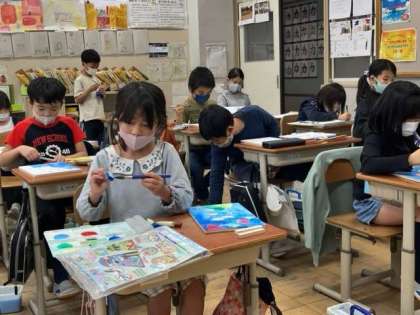 図工の学習です。釘を打って輪ゴムをかけて、ビー玉を使って遊ぶ作品を作ります。板にかいた下絵に、絵の具で丁寧に色をつけていきました。