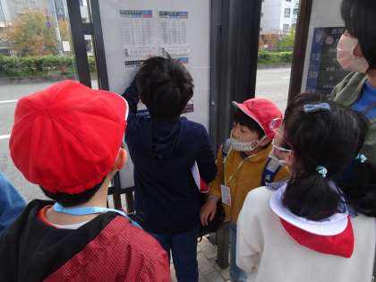 新町小学校から西の場所にある「北野天満宮」「翔鸞公園」へ出かけました。自分たちで市バスの系統番号や停留所の名前を覚え、時刻表で乗車するバスの時刻を確かめる学習をして、出かけました。北野天満宮までは、いろいろな系統番号の市バスに乗って行けることが分かり、今回は、「いろいろな市バスに乗りたい。」という子どもたちの意見から、行きは市バスの9番と203番に乗り、帰りは50番に乗りました。