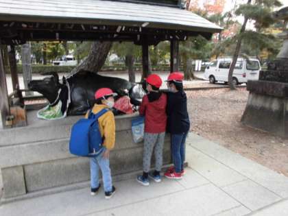 北野天満宮では、梅のマークがあちらこちらにあることを見つけたり、撫牛を触ったりしました。また、歴史に関係することを見つけることもできました。