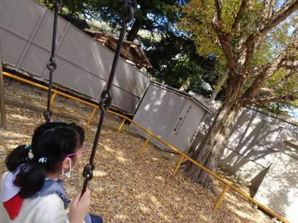 北野天満宮から翔鸞公園までは、上七軒を通って歩いて行きました。京都らしい町並みの様子を見て楽しみながら歩きました。翔鸞公園では、秋の様子を観察したり、いろいろな遊具で遊んだりして楽しむことができました。