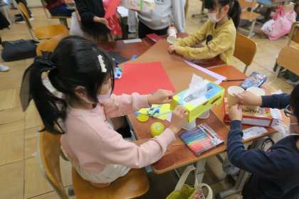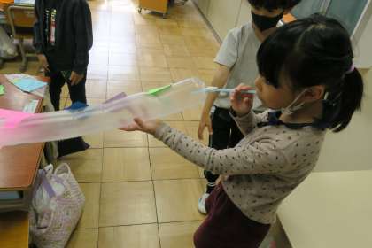 にょきにょきとびだせ! 公開日 2022/11/17 更新日 2022/11/17 1年生のページ ビニール袋に空気をいれると、のびたり、おおきくなったりします。 その動きを利用しておもちゃ作り! 特性を生かした作品がたくさんで楽しいです!