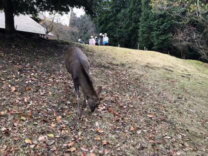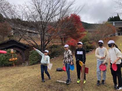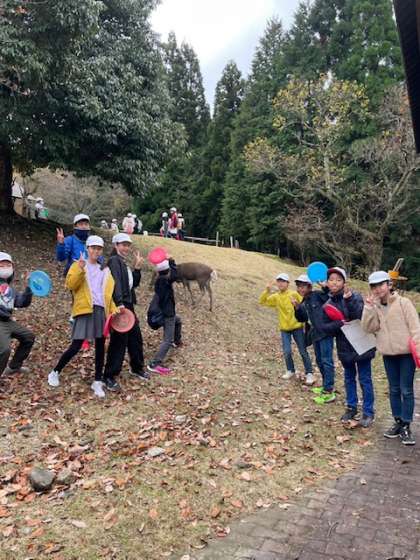 5年生はフライングディスクゴルフです。鹿との出会いもあったようです。