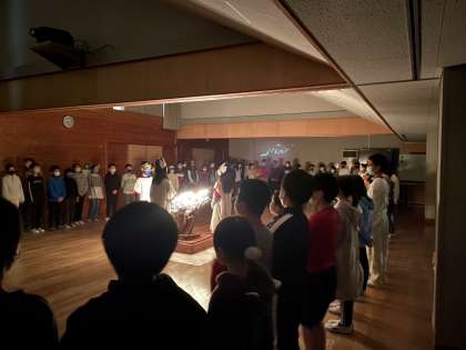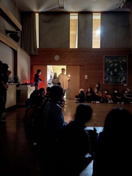 5年生のキャンドルファイヤーが始まりました。火の神から火をもらって点火しました。