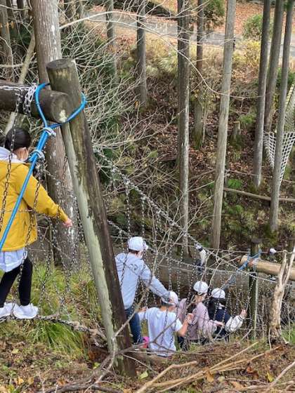 5年生は冒険の森に来ています。少し怖がりながらも楽しんでいます。