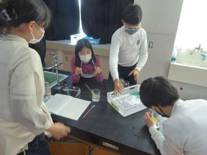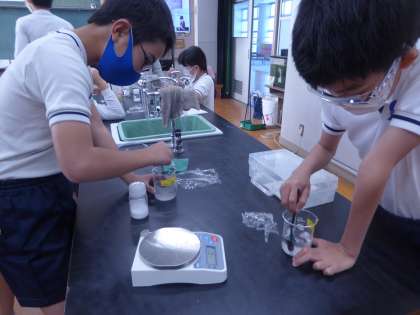 5年生 理科〜ものの溶け方〜 公開日 2022/11/25 更新日 2022/11/25 5年生のページ 食塩とミョウバンは水の量を増やすとどうなるのか。前回の実験で溶けなかった分を混ぜて溶かしていく実験をしました。
