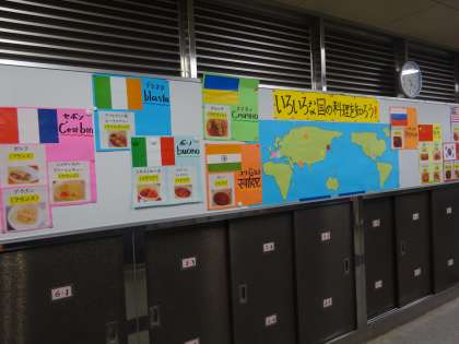 12月の給食目標は、「いろいろな国の料理を知ろう」です。給食室には、世界地図がありいろいろな国の料理を紹介しています。12月の給食には、いろいろな国の料理が登場します。本日配布しております、「ぱくぱくだより」にも詳しく書かれていますので、ぜひご確認ください。