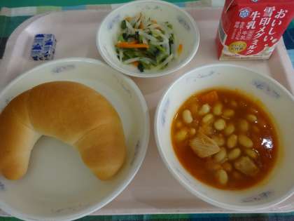 今日の給食は、バタークロワッサン・牛乳・大豆と鶏肉のトマト煮・小松菜のソテーでした。