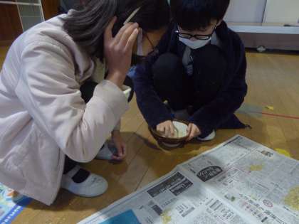5年生 わくわく学習〜籾摺りをしよう〜 公開日 2022/12/08 更新日 2022/12/08 5年生のページ 前回の学習で脱穀したお米の籾摺りをしました。籾から籾殻を取り除いて玄米にしていきました。すり鉢とボールを使い少しずつ作業していきました。