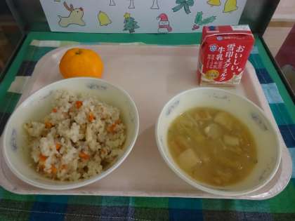 今日の給食は、炊き込み五目ごはん・牛乳・みそ汁・みかんでした。