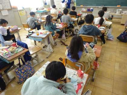 今日はみかんもありました。夏場は冷凍みかんですが、冬場は生のみかんです。和歌山県産の有田みかんでした。「甘くておいしかったです!」と子どもたちは喜んでいました。