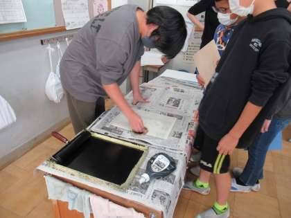 版で広がるわたしの思い 公開日 2022/12/10 更新日 2022/12/09 6年生のページ 図工の学習では、仏像の版を彫って刷っています。彫刻刀を使い分け、安全に気を付けて彫っています。版を刷るときは、友達と協力して取り組んでいます。2月の作品展に展示します。完成が楽しみです。