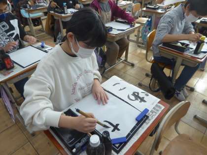 5年生 書写〜穂先の動きに気をつけよう〜 公開日 2022/12/13 更新日 2022/12/13 5年生のページ 穂先の動きに気をつけながら毛筆をしました。今回は「あこがれ」です。集中して取り組むことができました。