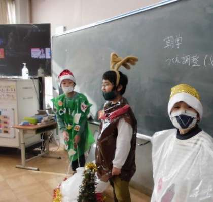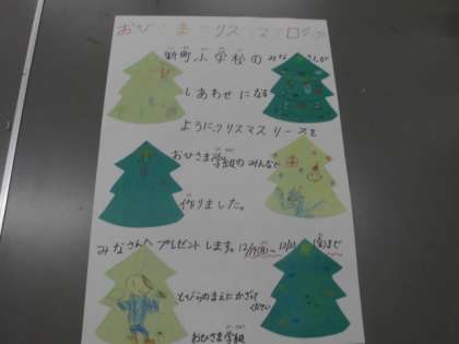 12月16日と19日の2日間を使って「おひさまクリスマスプロジェクト」の本番を行います。子どもたちが自作した衣装(サンタクロースやクリスマスツリー、トナカイ、雪だるま)を着て、子どもたちが作った「クリスマスリース)をプレゼントします。クリスマスリースは、各教室や特別教室、職員室等の入口に飾る予定です。(掲示期間は、今月23日までです。)サプライズ企画なので、おひさま学級の子どもたちは、ドキドキワクワクしていますが、「新町小学校のみんながもっとにこにこになって、一つになって欲しい。」という子どもたちの思いからスタートしています。